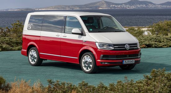 Outwardly, the T6 was recognisable above all by its redesigned front section. Its design combined stylish linearity with a highly dynamic appearance. The T6 also gained charisma, exclusivity and dynamism through its low-drawn front apron. New two-tone paint finishes represented a tribute to the first VW Bus generations. The range of engines included four new TDIs and two new TSIs, each with a capacity of two litres. In comparison with the previous model, the new engines saved around one litre of fuel. All drive systems had a Start/Stop function as standard. The power output ranged from 62 kW (84 PS) to 150 kW (204 PS). Depending on power output, they were coupled with a five- or six-speed manual gearbox or a seven-speed DSG. In addition, many variants could be ordered with 4MOTION all-wheel drive. A highlight was the optional adaptive chassis control DCC. In addition, the T6 brought many new assist and safety systems to the product line.